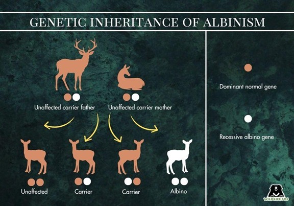 Albinism follows a recessive inheritance pattern, meaning an animal must inherit two copies of the mutated gene (one from each parent) to display the condition.