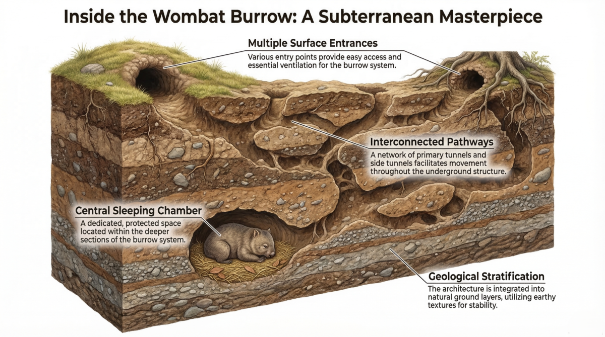 - Screenshot suggestion: A labeled diagram of a wombat burrow system with multiple entrances, tunnels, and nesting chambers would help readers visualize how central burrows are to wombat behavior.