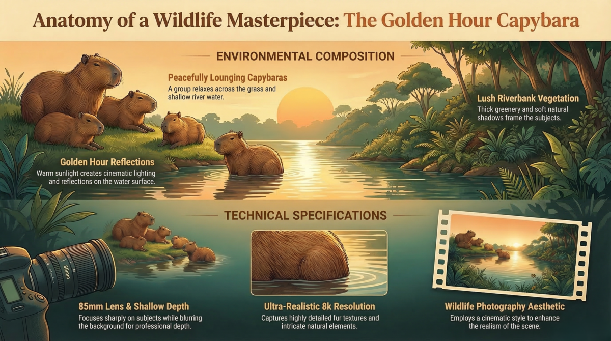 A capybara swimming gracefully is one of the most important images to include because it instantly shows its semi-aquatic lifestyle and highlights how its eyes, ears, and nostrils sit high on the head. An image of a capybara grazing in a lush wetland helps connect its feeding behavior to its habitat and shows how dependent the species is on vegetation-rich, water-linked ecosystems. A third standout image would be a capybara resting near or alongside other animals, such as birds, which visually supports its calm reputation and helps readers understand why it is so often described as placid and socially tolerant.