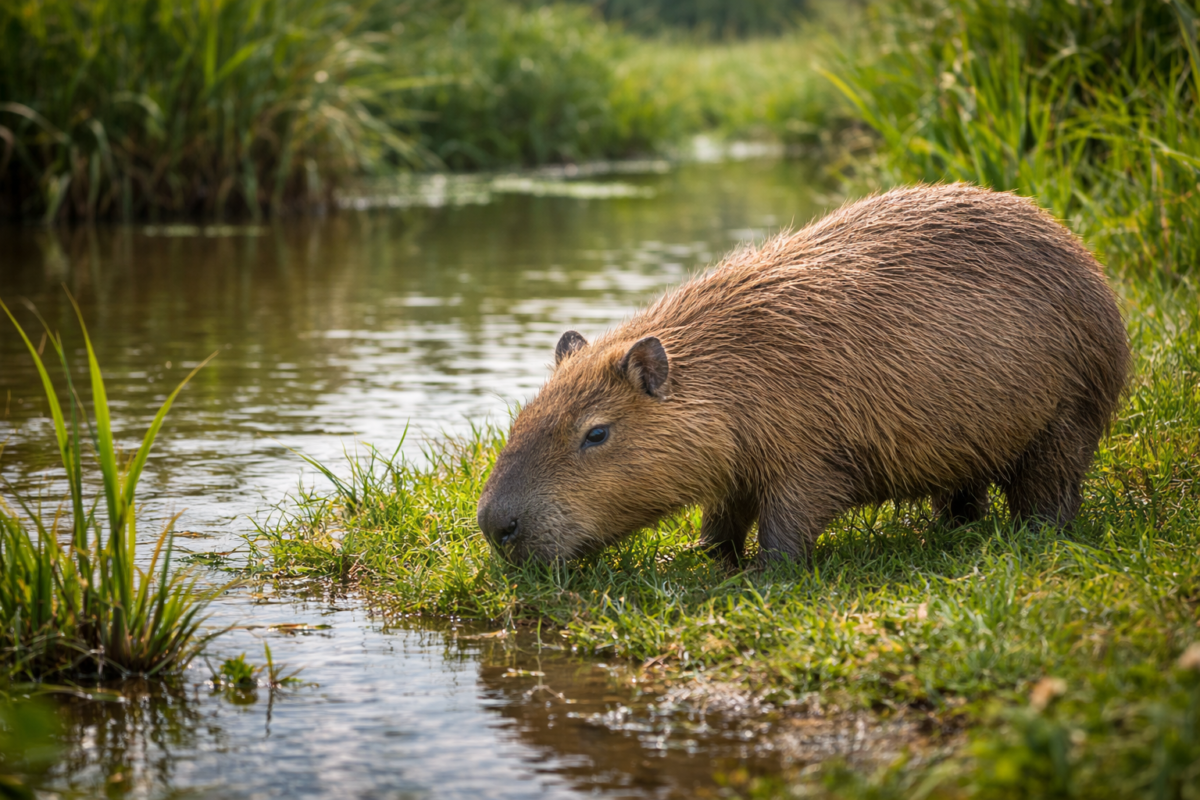 - Their feeding behavior reflects their semi-aquatic lifestyle. Capybaras typically graze on land close to rivers, marshes, and lakes, but they are also able to enter the water and consume aquatic vegetation. This gives them access to food sources that many land herbivores cannot use as easily. In practical terms, water is not just a place for safety or cooling. It is also part of their feeding landscape.