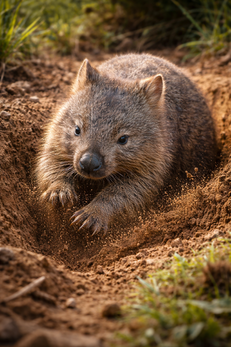 - The wombat, a member of the Vombatidae family, is one of Australia’s most distinctive native mammals. Stocky, muscular, and built close to the ground, the wombat is a marsupial specially adapted for a life centered on digging and burrowing. While it may appear slow and heavy at first glance, this sturdy animal is an impressive excavator capable of creating complex underground tunnel systems that provide shelter from predators, harsh weather, and extreme temperatures. Its entire body reflects the demands of this underground lifestyle.